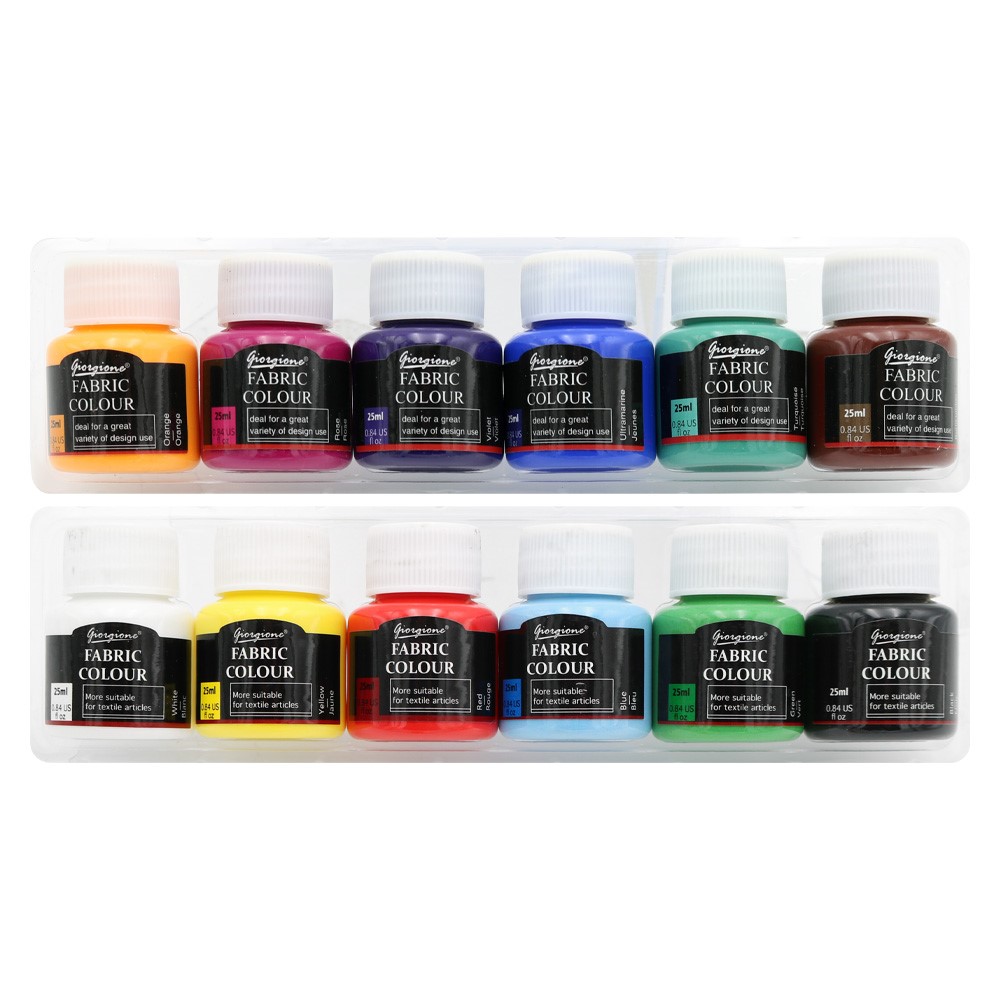 Sada kvalitných farieb na textil v tubách 25 ml obsahuje všetky základné farby + štetec.