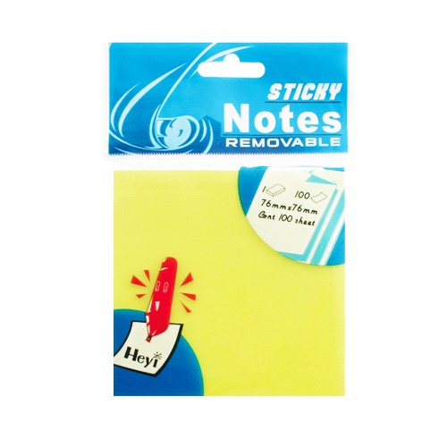 Papierové samolepiace lístky žltej farby v bloku, rozmer 76 x 76 mm, lepidlo umožňuje opakované použitie lístkov, pričom nezanecháva stopy, blok obsahuje 100 samolepiacich lístkov.