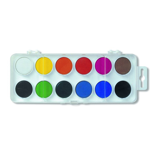 Vodové farby veľké, 12-farebná sada, netoxické, dodávané bez štetca v plastovom boxe. Vodové farby sú určené na maľovanie na papier a iné savé materiály, riediteľné vodou. Tableta priemer 22,3, výška 4,5mm.