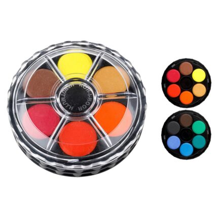 12-farebná sada netoxických vodových farieb, dodávaná v okrúhlom plastovom boxe s uzatváraním na závit. Priemer tablety 22,5 mm, vodou riediteľné, vhodné na papier a iné savé materiály, dve vrstvy po 6 tabliet, t.j. 12 odtieňov farieb: žltá citrónová, oker svetlý, oranž., rumelka červená sv., karmínová, ultramarín sv., modrá kobalt, zelená sv., zelená tm., siena pálená, umbra pálená, čierna.