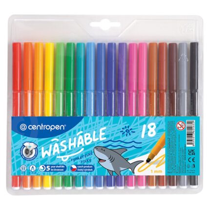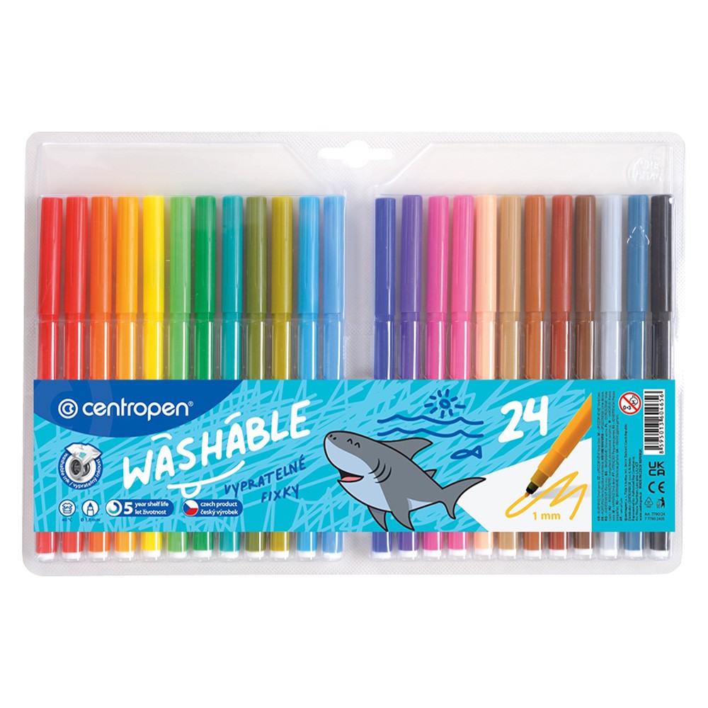 24-kusová farebná sada vyprateľných farebných popisovačov s ventilačným uzáverom, odolných voči vyschnutiu minimálne 3 roky; valcovné hroty priemeru 1,8 mm sú odolné voči zatlačeniu; dodávané sú v plastovom puzdre s eurozávesom.