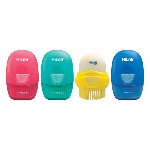Guma MILAN s kefkou, v obľúbenom dizajne Capsule. Z jednej strany sa nachádza guma na gumovanie, na druhej strane gumová kefka, ideálna na šetrné odtránenie zvyškou gumovania. Obidve časti sú chránené víčkom proti prípadnému zašpineniu. V ponuke v štyroch farbách: červená; zelená; žltá; modrá.