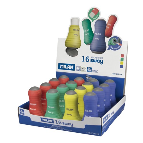 Guma so strúhadlom MILAN, v obľúbenom dizajne Sway. Z jednej strany sa nachádza okrúhla guma, z druhej – širšej strany – strúhadlo s kvalitnou čepeľou z uhlíkovej ocele. Vybavené bezpečnostným systémom proti oddelení čepele od strúhadla. Vhodné pre širokú škálu grafitových ceruziek. V atraktívnych farebných kombináciach.
