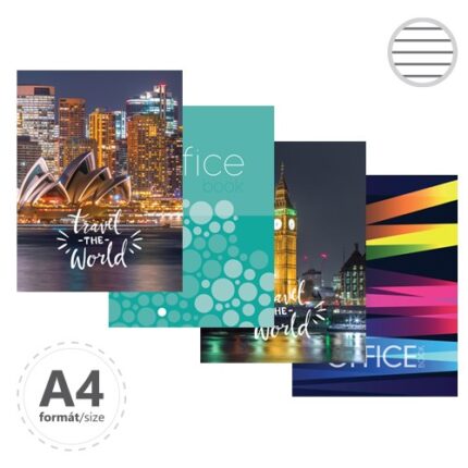Záznamové knihy A4 sú vyrobené z bezdrevného písacieho papiera. Obálka je vyrobená z tvrdého kartóna, ktorý je potlačený rôznymi farebnými motívmi a potiahnutý laminom. (4 dizajny). Linajková – 96 listová. Na palete sa nachádza 1260 ks.