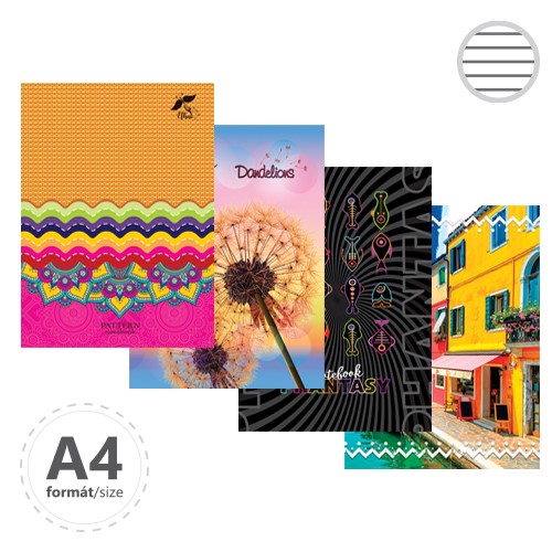 Záznamové knihy A4 sú vyrobené z bezdrevného písacieho papiera. Obálka je vyrobená z tvrdého kartóna, ktorý je potlačený rôznymi farebnými motívmi a potiahnutý laminom. Linajková - 144 listov.