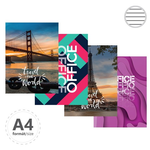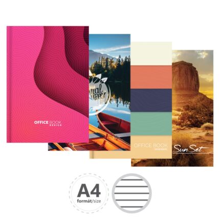 Záznamové knihy A4 sú vyrobené z bezdrevného písacieho papiera. Obálka je vyrobená z tvrdého kartóna, ktorý je potlačený rôznymi farebnými motívmi a potiahnutý laminom. (4 dizajny). Čistá - 96 listová.