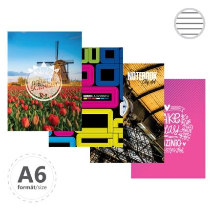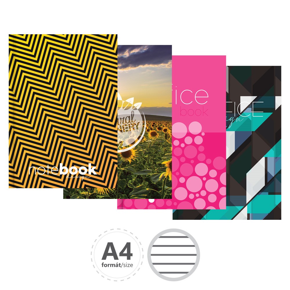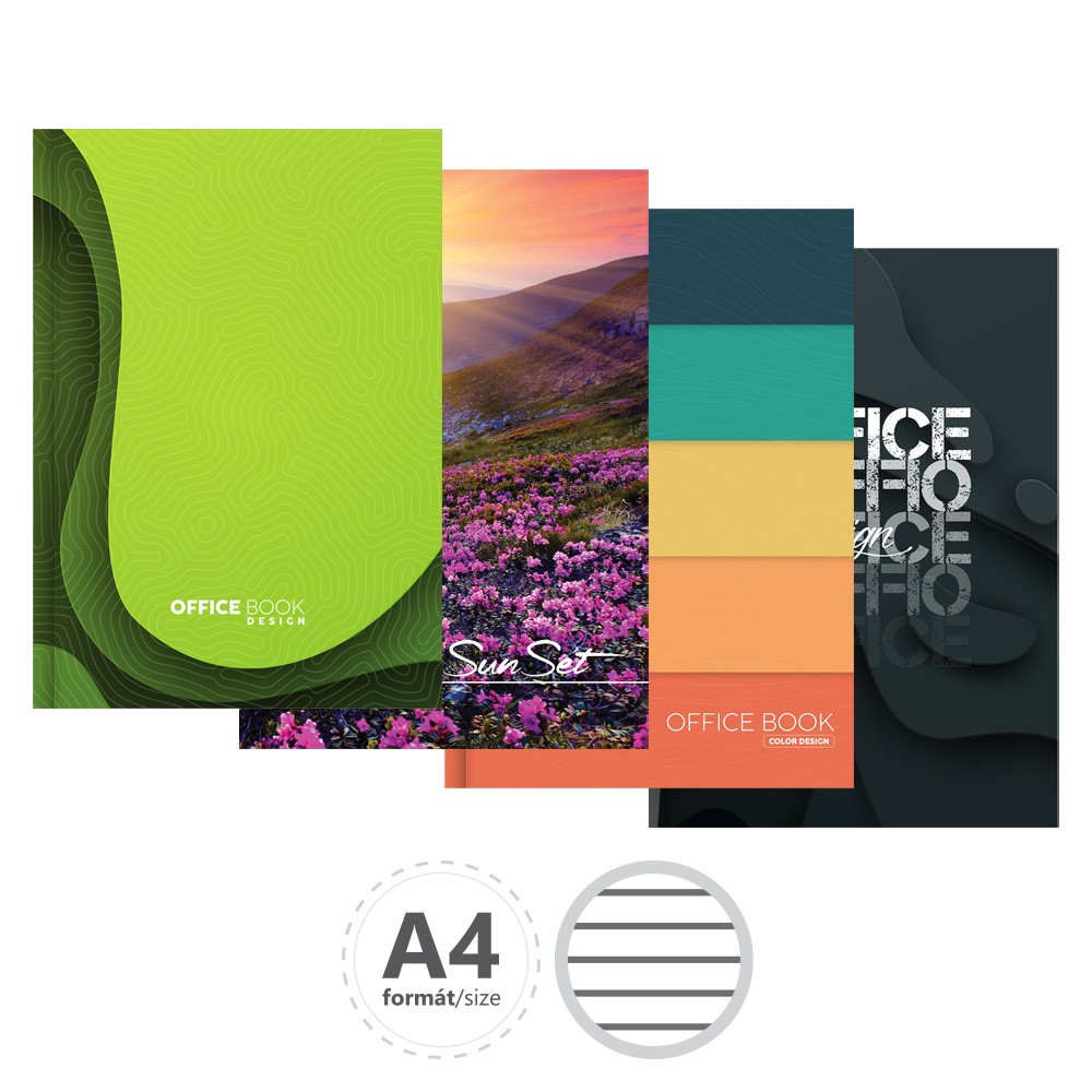 Záznamové knihy A4 sú vyrobené z bezdrevného písacieho papiera. Obálka je vyrobená z tvrdého kartóna, ktorý je potlačený rôznymi farebnými motívmi a potiahnutý laminom. Linajková – 144 listov.