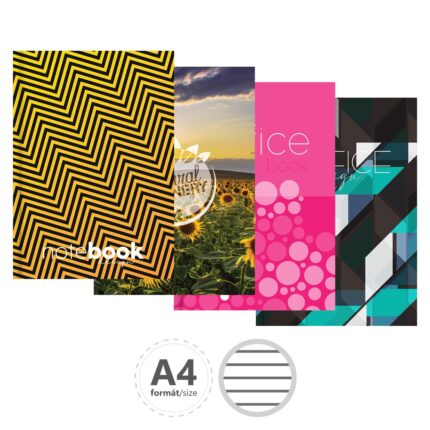 Záznamové knihy A4 sú vyrobené z bezdrevného písacieho papiera. Obálka je vyrobená z tvrdého kartóna, ktorý je potlačený rôznymi farebnými motívmi a potiahnutý laminom. Linajková - 144 listov.