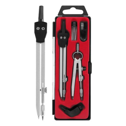 Školské kružidlo z kovu v kombinácii s plastom, balené v plastovom puzdre, s náhradnými ceruzkovými tuhami a príslušenstvom.