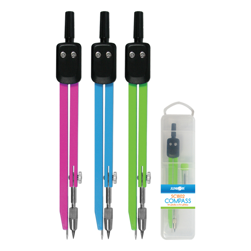 Školské kovové kružidlo s plastovým úchytom. Pevné, bez ohybného ramena. Balené v praktickej plastovej krabičke. Dodávané v štyroch pastelových farbách: ružovej, zelenej, modrej, žltej.