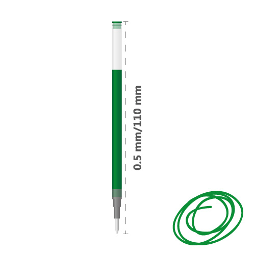 Gélová náplň do pera, zelená farba, dĺžka 110 mm, priemer guľôčky 0,5 mm.