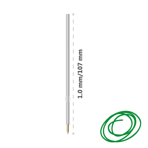 Zelená guľôčková náplň do pera, dĺžka 107 mm, s krídelkami na zachytenie pružinky, priemer guľôčky 1 mm.