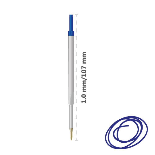 Modrá guľôčková náplň do pera, dĺžka 107 mm, s krídelkami na zachytenie pružinky, priemer guľôčky 1 mm.