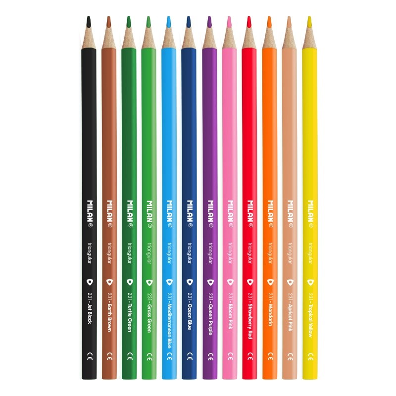 Šesťhranné farebné pastelky MILAN, sada 12ks. Silná tuha 3,3 mm, s ochranným systémom LPS ( lead protection system ), ktorý zvyšuje odolnosť proti lámaniu. Balené v papierovom boxe.