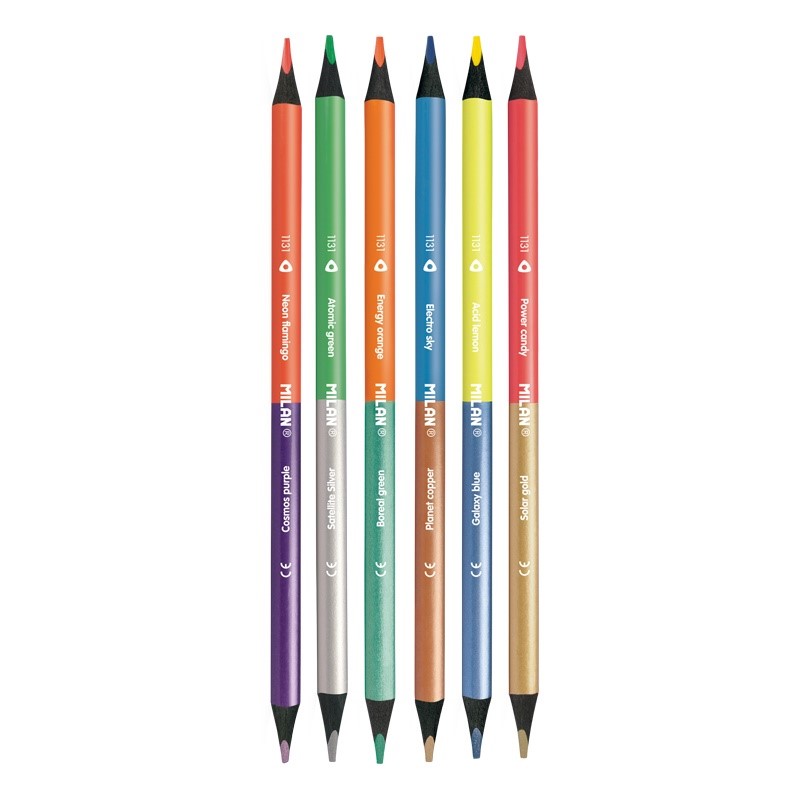 Obojstranné trojhranné pastelky z lipového dreva. Odolné proti lámaniu. Pastelky majú metalické/neónové farby ,celkovo obsahuje 12 rozdielnych farieb.