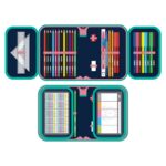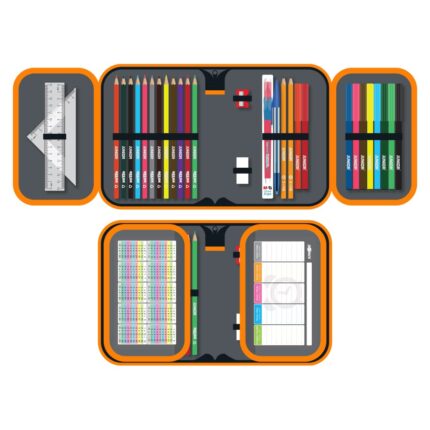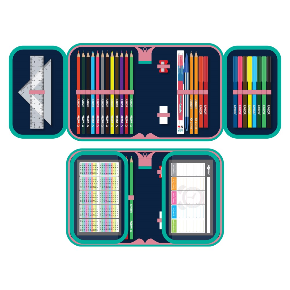 Naplnený, 1-poschodový peračník JUNIOR s rozvrhom hodín a malou násobilkou.