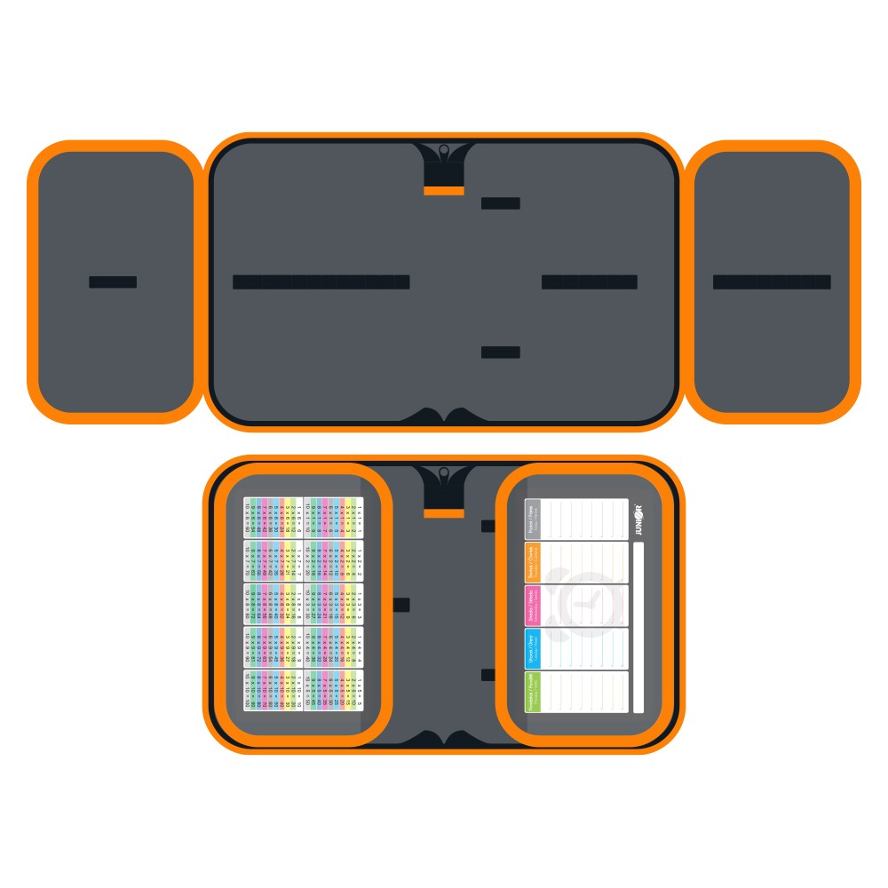Naplnený, 1-poschodový peračník JUNIOR s rozvrhom hodín a malou násobilkou.
