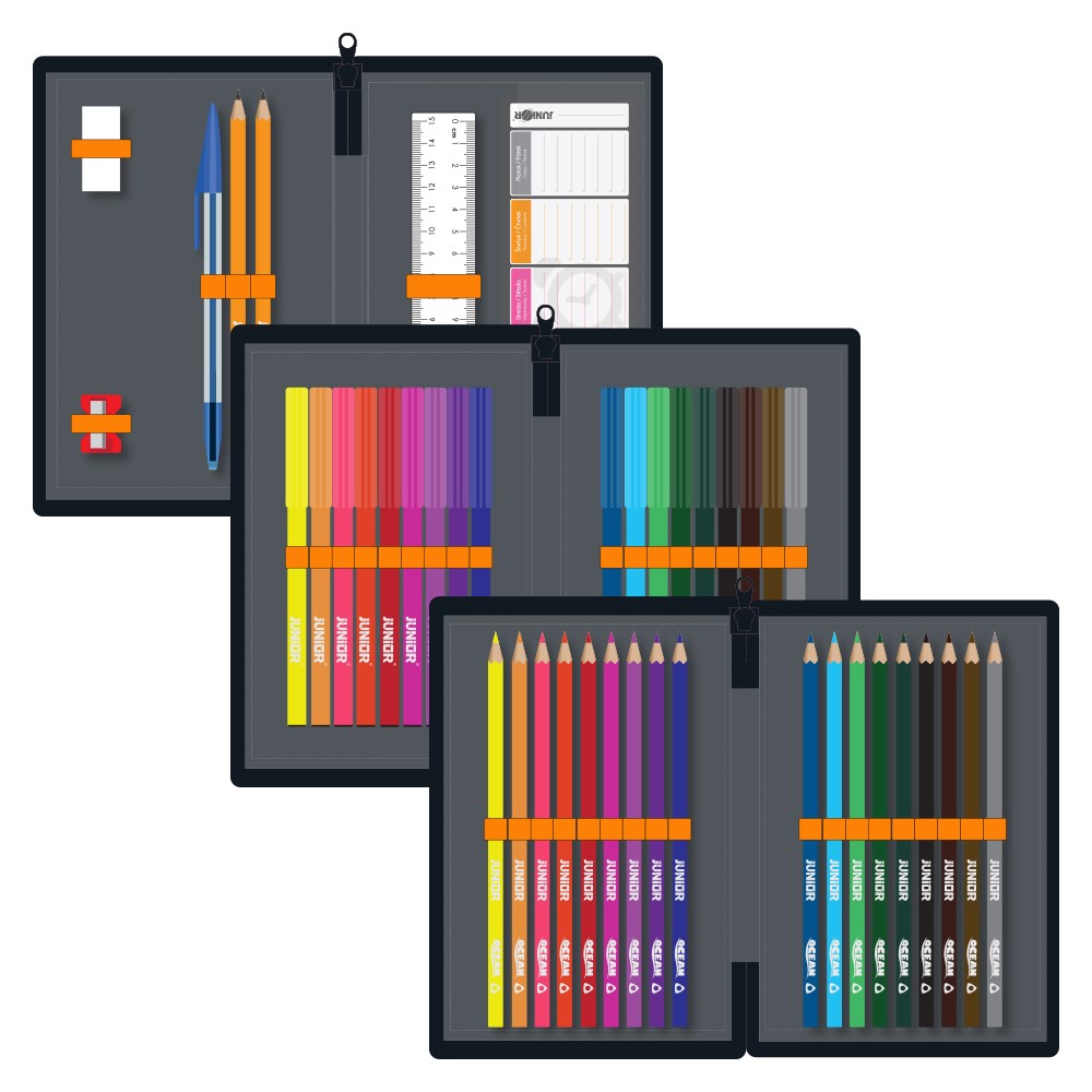 Naplnený, 3-poschodový peračník JUNIOR s rozvrhom hodín.