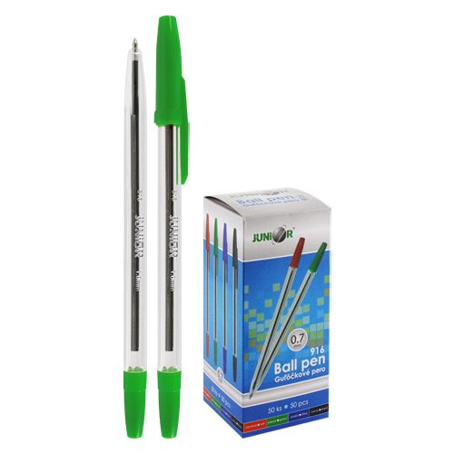 Jednorazové guličkové pero s transparentným čírym telom, so zakončením a uzáverom vo farbe náplne.