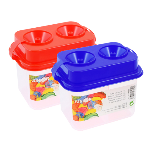 Dvojitý pohár na čistenie štetcov z priesvitného plastu, s farebným vrchnákom, s dvojitými bezpečnostnými uzávermi. Praktický otvor v tvare lieviku, dobre drží štetce a zabraňuje tak nechcenému vyliatiu vody.