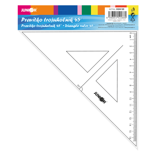 Trojuholník s ryskou, s pravítkom na pravej odvesne 16 cm, vyrobený z transparentného PVC.