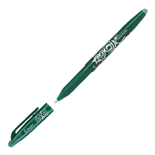 Farba: zelená. Prepisovateľný roller Frixion Ball. Jedinečný výrobok, ideálny nielen pre školákov. Špeciálny atrament – napísaný text je možné vymazať a znovu prepísať na tom istom mieste toľkokrát, koľkokrát chcete. Text zneviditeľníte zahriatím na 65 ° C, ktoré vznikne trením („gumovaním“) plastového zakončenia rolleru na papieri. Znovu sa objaví pri teplote nižšej ako -15 ° C. Pero má vymeniteľnú náplň a je dostupné v širokej farebnej škále. Nepoužívajte na oficiálne dokumenty.