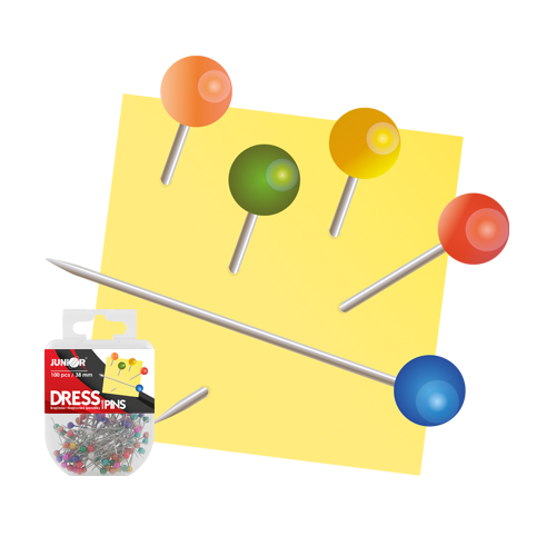 Poniklované špendlíky, dĺžka 38 mm, balené po 100 ks v plastovej krabičke so závesom.